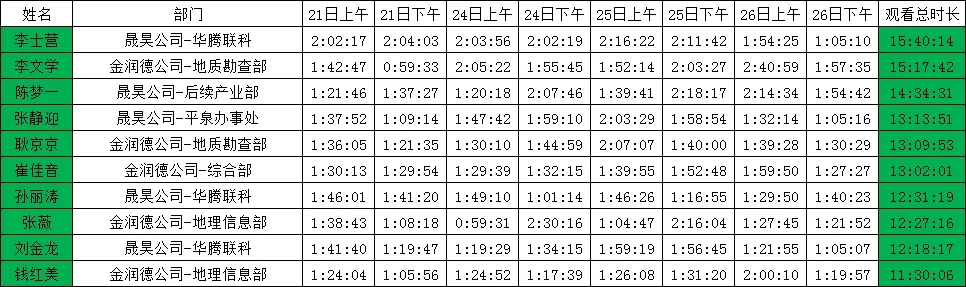 新一周的培訓(xùn)結(jié)束了,為進一步提高學(xué)習(xí)質(zhì)量,保證線上學(xué)習(xí)不走形式,集團人力資源部對全體員工2月21-26日的學(xué)習(xí)時長進行了統(tǒng)計,并查閱了學(xué)習(xí)筆記,經(jīng)統(tǒng)計共有李士營、李文學(xué)等10名員工學(xué)習(xí)時間最長最認(rèn)真,不僅參加了在線學(xué)習(xí),筆記記錄完整,課后還能反復(fù)觀看回放加以鞏固知識。隨著員工們的陸續(xù)復(fù)工,希望大家當(dāng)工作時間與線上學(xué)習(xí)時間沖突時,做到工作為主,同時能利用空閑時間觀看回放,做到線上學(xué)習(xí)常態(tài)化。